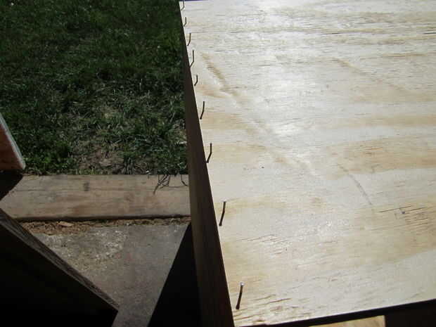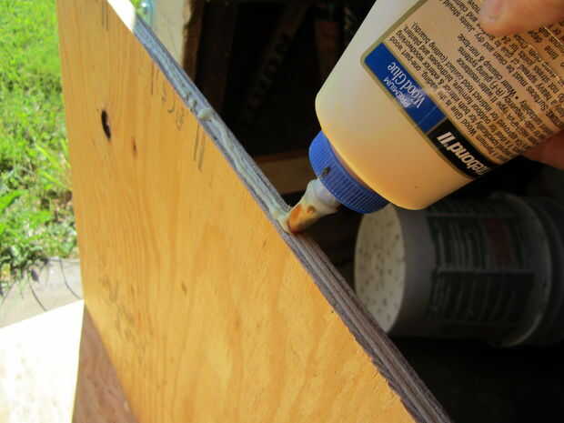 Establecer algún pegamento para madera a lo largo de los bordes y clávelos en su lugar con las pulgadas de 1 1/2 clavos de acabados. Yo siete clavos cada borde y parece bastante seguro.