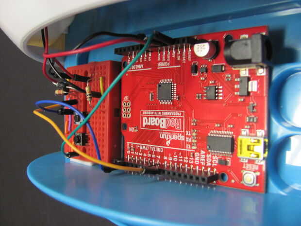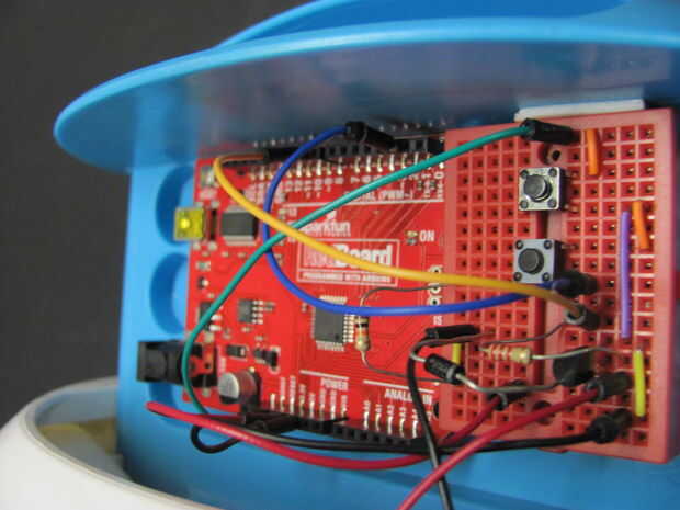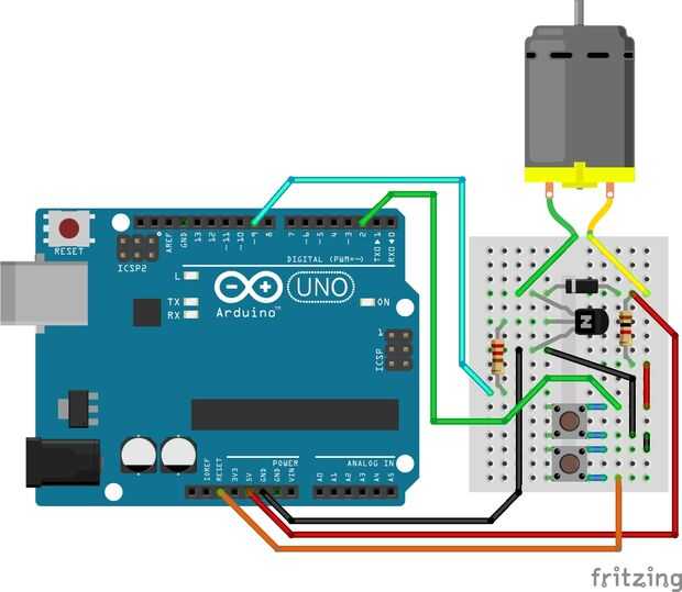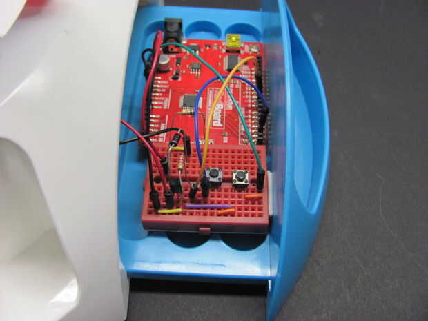 En primer lugar, la soldadura de dos alambres de puente largo a los cables que salen del motor y la cubierta de que las articulaciones con el calor del encogimiento. A continuación fije mini protoboard al cajón con cinta de doble cara. Para el circuito del motor utilizamos el diagrama del circuito que se muestra arriba. Es un circuito básico del motor para el Arduino, utilizando un transistor, diodo y resistor. Deberá agregar dos botones, uno para cambiar los programas y otro para volver al primer programa.
