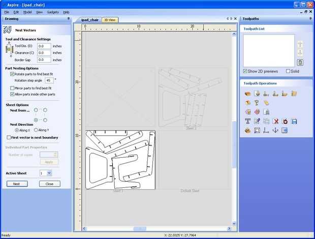 Exporta el dibujo de las piezas vía DXF para mi programa Vectric Aspire CAM. Aquí duplica las partes para lo que sea necesario y utilizar la función de anidación para llenar el tamaño de la cartulina que tenía. Normalmente yo sería restringir la cantidad de rotación permitido para mantener una dirección constante de grano, pero esta vez dejé que gire a cualquier ángulo (pantalla dice 45 º, pero en realidad utilicé 5deg). Quería el producto terminado para ver tipo de cattywampus.