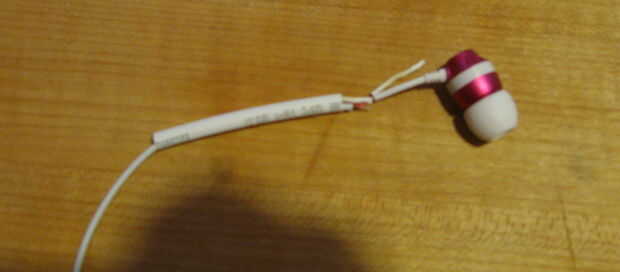 Partido de los empalmes así que se sube hacia el auricular, y la otra desciende hacia la toma. Ahora deslice el tubo termo retráctil de 1/8" en ambos empalmes, utilizar un encendedor para reducir hacia abajo, y listo.