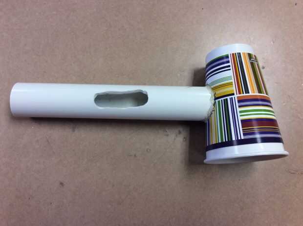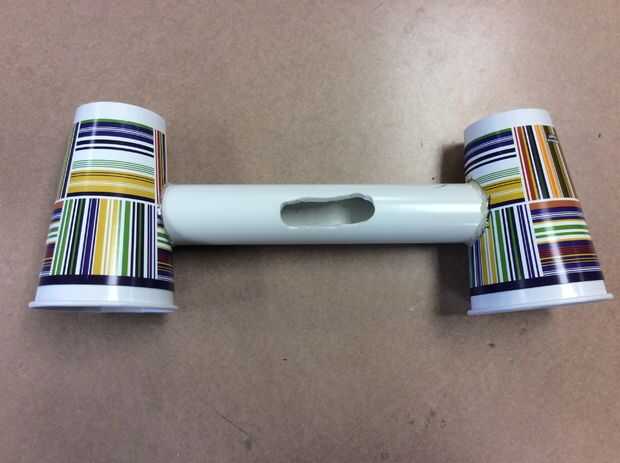 Las dos tazas que haga un agujero en, conecte en los dos extremos del tubo de PVC con pegamento caliente.