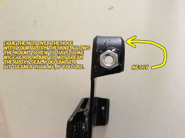 8. pegar la tuerca en el agujero con su epoxi. El agujero permite el tornillo de montaje tener algunos