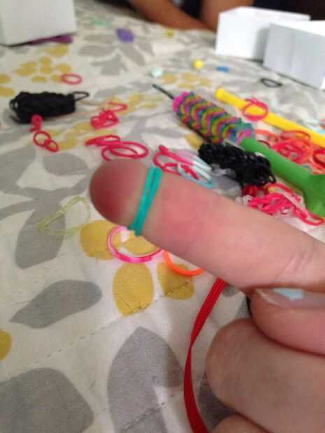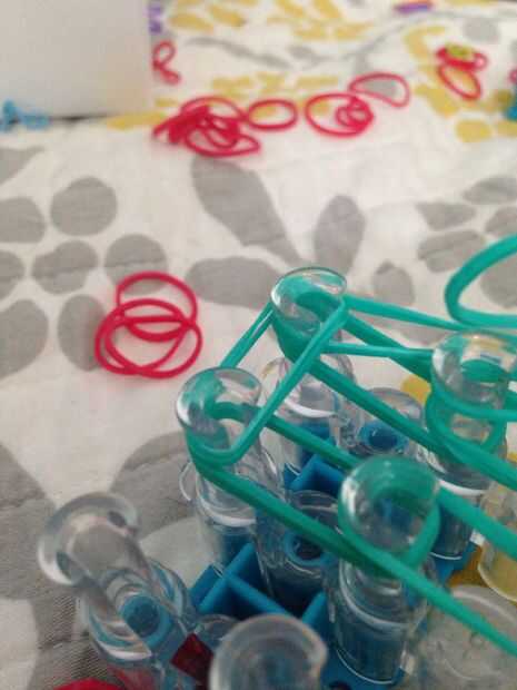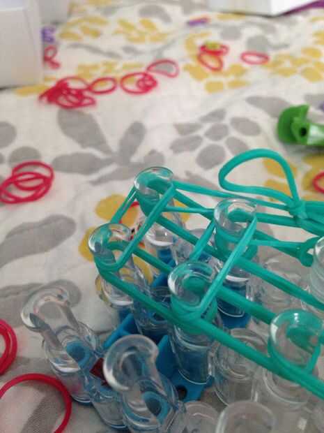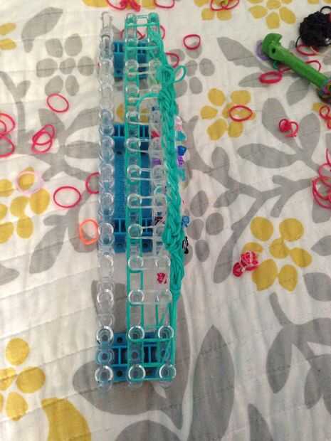 esto es un braclet muy fácil y divertido para hacer. Esperamos que disfrutes!Paso 1: materiales Se necesita: un telar, gancho, elásticos y un clip de C.Paso 2: Colocar los elásticos Primero escoger tres colores y a la clavija central. Sacó su color e