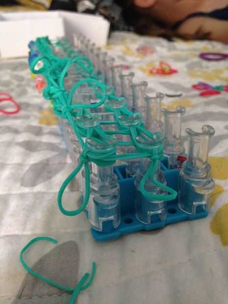 esto es un braclet muy fácil y divertido para hacer. Esperamos que disfrutes!Paso 1: materiales Se necesita: un telar, gancho, elásticos y un clip de C.Paso 2: Colocar los elásticos Primero escoger tres colores y a la clavija central. Sacó su color e