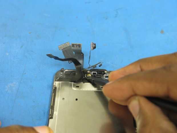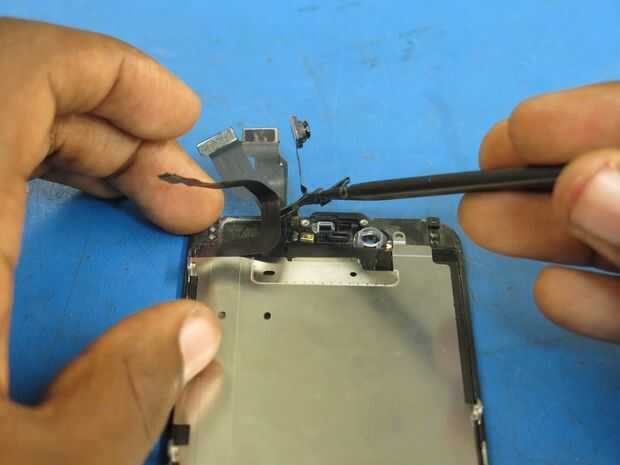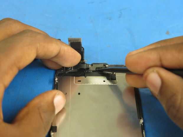 • Utilice su spudger para levantar para arriba a la derecha de la cámara y sensor de cable para el micrófono de frente. No retire completamente el cable, sin embargo, como el micrófono todavía conecta con la pantalla.