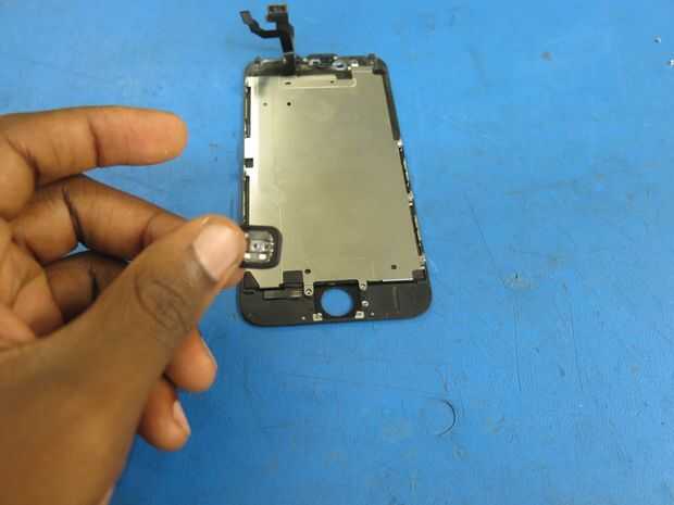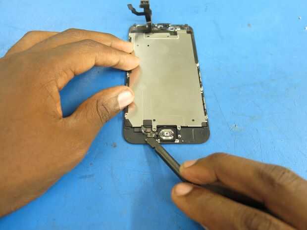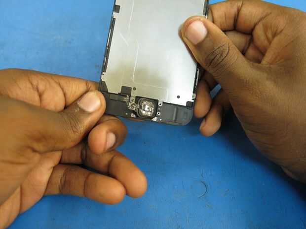 • Una vez que el cable está libre de su adhesivo, utilice un dedo para empujar el botón de inicio fuera de su casa desde el frente de la pantalla y retirarlo, póngala a un lado.