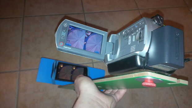 Una vez que han atado la cámara (como se muestra) a un agujero o ranura en la madera verde, haga ajustes finos al apuntar la cámara a la pantalla. Ajustes horizontales se realizan simplemente por la madera azul sosteniendo el teléfono que gira o gira la cámara a un lado. También puede deslizar el teléfono a un lado de la pieza azul de la madera.