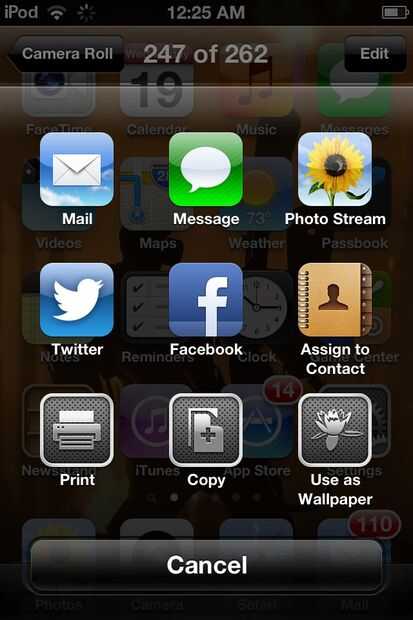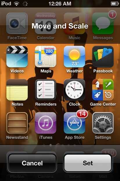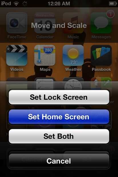 Abrir "fotos" luego ir a cámara de rollo, encontrar la imagen y presione el botón en la parte inferior izquierda. Luego golpeó "hacer fondo de pantalla", no cambiar la escala, pulse "set", luego "establecer como pantalla de inicio."