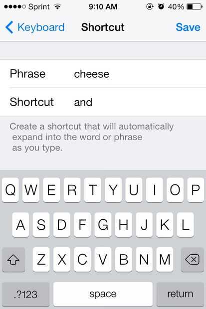 Escriba una palabra tonta, como el queso, para el acceso directo. Pulse guardar.