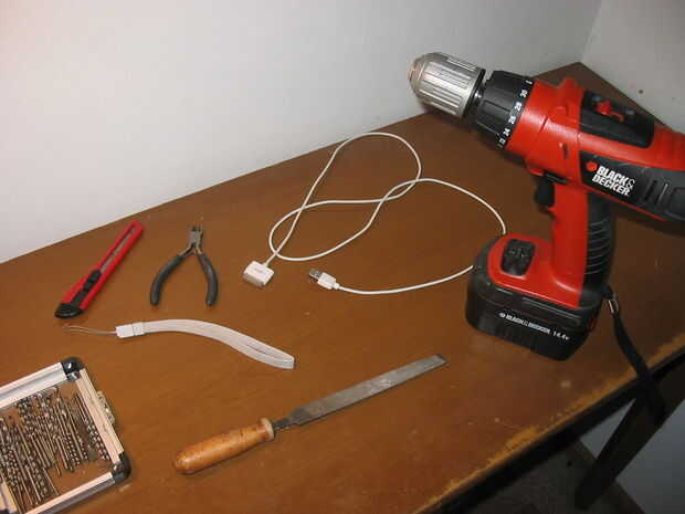 Todo lo que realmente necesitas es un iPod dock conector, debe ser el tipo de bloqueo (encontré uno en una tienda de hardwear de equipo por $3) o si tienes una solo puesta alrededor de recoger el polvo puede utilizar que. Usted también necesitará una banda de muñeca (yo usé uno de los viejos cinturones de mote wii. Además aprieta alrededor de su muñeca para que no caiga). Herramientas que usted necesitará son un taladro, brocas y cortadores de alambre.