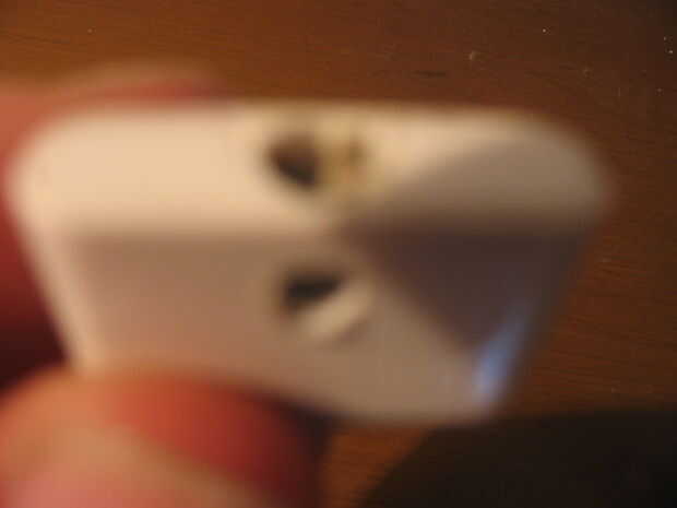 a continuación, perfore un agujero de unos 3-5 mm (utilice su criterio) de la parte inferior del conector (lado sin logo o palabras). el agujero debe ser un poco menor que doble el tamaño de la correa para la muñeca que vas a usar. Tenga cuidado al taladrar porque usted se perforación a través del plástico y el metal que se encuentra dentro el conector. Asegúrese también de utilizar alicates de punta para