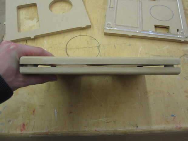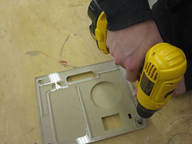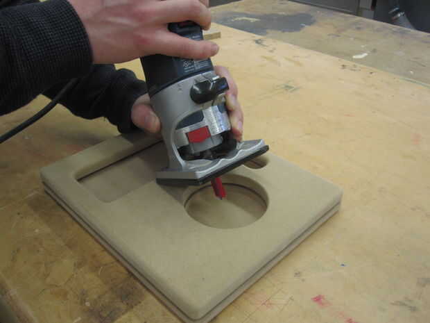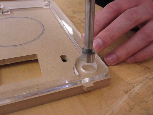 Línea de medio acrílico para que pueden perforar los agujeros en el MDF para clavijas. Taladre 4 agujeros en cada panel MDF. Ser lo más preciso posible para que los paneles estén alineados correctamente. Cortar la clavija clavijas de 1/2 pulgada que cabrán en los agujeros. Encajar los paneles para que pueda utilizar un router de mano para corte un pozo en la parte trasera para el espacio de un altavoz adicional.