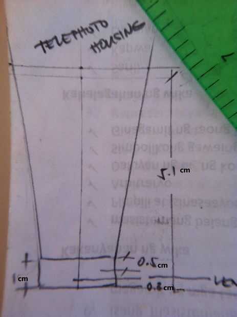 utilicé embudo de plástico para este proyecto, un ensayo y error con las lentes para lograr zoom primero un objeto a distancia. Hacer un patrón de diseño con medidas basadas en mis pruebas. Corte el embudo según diseño hice., como se muestra en imágenes. Luego adjunta el ocular en su bisel de pre construido. y vuelva a ejecutar una prueba., hasta lograr hacer zoom a un objeto, esto es la más interesante parte del proyecto fue "la prueba de la lente"