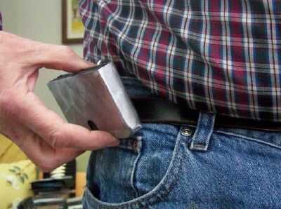 La curva extra en la presilla (línea amarilla en la segunda foto del paso 5) hace que la parte superior de la caja del teléfono a hacia fuera la punta de mi cintura cuando Deslice hacia arriba la caja del teléfono en mi cinturón. El ángulo exterior sería acerca de lo que se muestra en la foto, incluso si no tengo mi mano en la caja del teléfono. Este vuelco hacia afuera me da mejor entre mi cintura y mi ropa. La foto muestra la caja del teléfono con puntas hacia afuera. Ir al siguiente paso para la siguiente parte de retirar el teléfono de la caja.