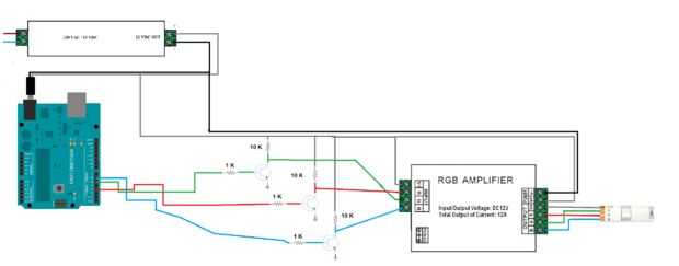 Se puede utilizar una sola tira de LED RGB o LED. Conexiones que se muestra en la imagen son sólo para cátodo común RGB LED. Si usted está planeando utilizar la tira de LED RGB necesita fuente de alimentación de 12 V, amplificador RGB, algunas resistencias y tres Transistores npn así. Voy a actualizar el circuito de ejemplo para el uso de tira de LED más adelante.