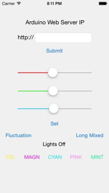 Con este código y de la aplicación puede establecer colores que usted quiere con los tres cursores. Cada regulador tiene 17 posiciones, teóricamente que son capaces de establecer más 4 000 diferentes colores. Debería ser suficiente para RGB LED y tiras.