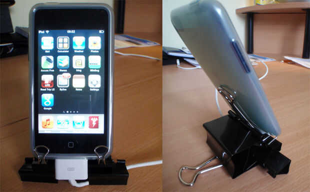 inspirado por otros (chicos gracias sabes quien eres) decidí hacer un soporte para mi iPod Touch 3G (que no vienen con un soporte) usando esa grapa fija... clips binder. Aunque algunos diseños inteligentes han demostrado antes, quería uno que podría aceptar el cable de carga por lo que podría sentar en mi escritorio todo el día.