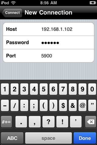 Lanzar la aplicación. En el menú Seleccione "Agregar conexión". Escriba la dirección IP de su ordenador, (que se encuentra ejecutando el ratón sobre el icono en la barra de tareas de HippoVNC) tipo le contraseña y seleccione 'Hecho'.