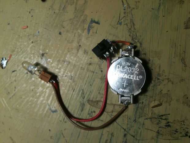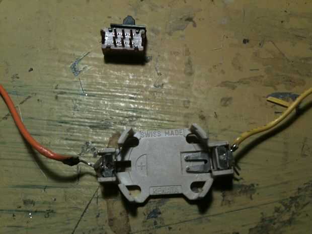 Deje los cables en el conector JST tiempo suficiente para permitir que la tapa girar una vez que esté montada. Pele los extremos de los cables. Soldar un cable de la JST al poste negativo de soporte de la batería. Attatch otro al poste negativo del interruptor. El pequeño trozo de alambre es soldada a los postes positivos del portapilas y el interruptor. Inserte la batería y probar el circuito.