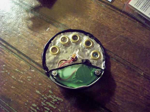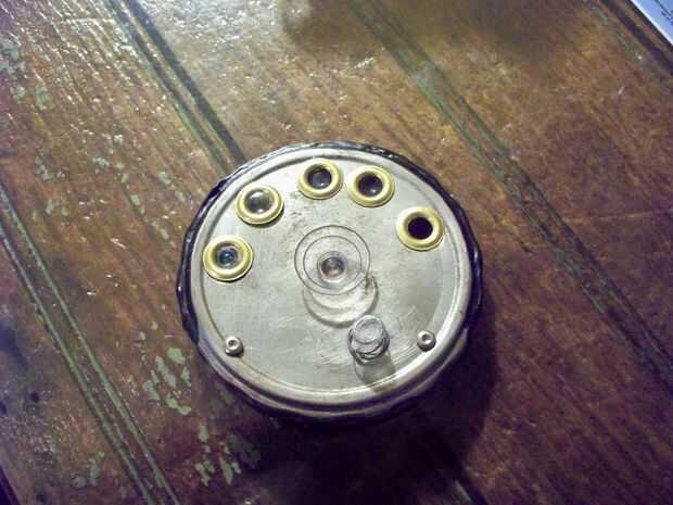 hice un poquito más de trabajo en mi lupa. He instalado un resorte con un slider que automáticamente Mantenga las lentes al ras con la lente de la cámara, agregó una cubierta para la batería, corte más del borde de la tapadera, construido alrededor de las lentes con una masilla epoxi de dos partes, forrado con cinta de aluminio reflectante, pegan de anillos de latón alrededor de las lentes y terminar los bordes con salsa de mango de herramienta.
