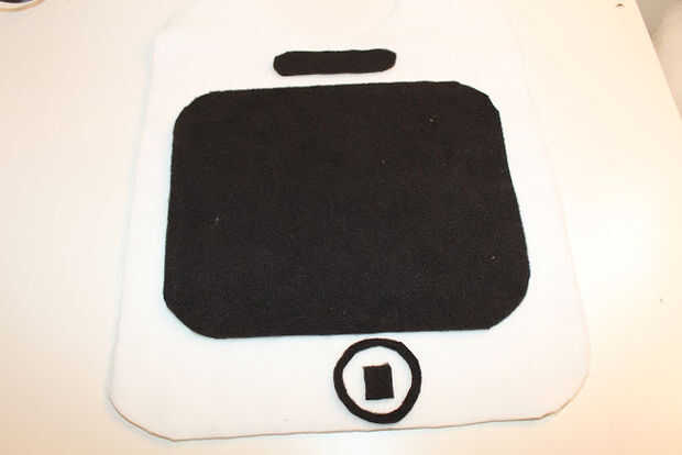 Ahora, cortar un rectángulo de la pantalla (uso un CD de los cantos como se hizo anteriormente), un pequeño rectángulo redondeado para el auricular y un círculo y un cuadrado para el botón de encendido. Posición y pegamento caliente estos componentes en su lugar.