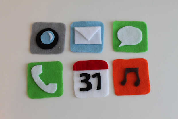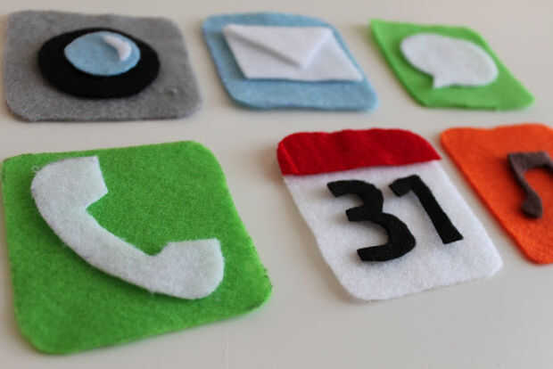 Esto es muy divertido parte! Determinar las aplicaciones que quieres hacer para tu disfraz. Miré mi teléfono y recoger varios de los más simples. Diseñé el 6 que ves abajo e incluido aquí si quieres imprimir y recortar para hacer usted mismo. Sólo cortar cada pieza en cartulina (que prefiero porque es más grueso) o papel de impresión regular y traza en cuadrados de fieltro. Corte cada componente y el pegamento caliente para montar. Ahora, a organizar tus aplicaciones en la pantalla y pegar caliente hacia abajo. ¡ Simple!