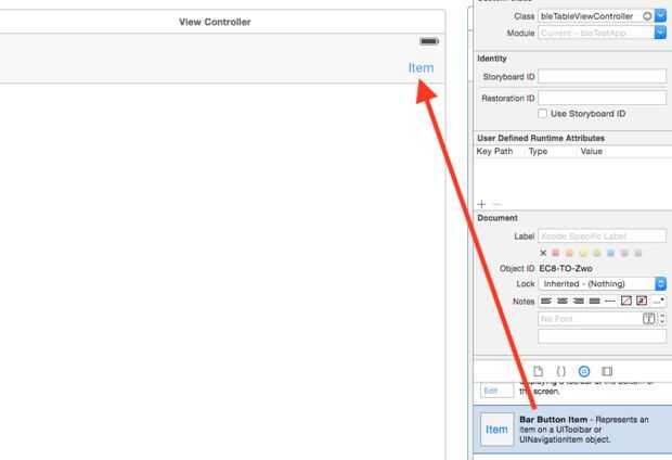 Interruptor principal vista controlador. Tenemos que agregar un botón de elemento de barra (no un botón regular), este botón tendrá que ir en la esquina superior derecha de su barra de navegación. Usamos este botón para segue al dispositivo BLE vista de tabla.