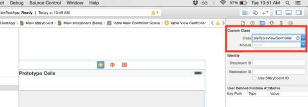 Tenemos que conectar el bleTableViewController.swift a nuestra mesa vista controlador añadimos. Para ello, haga clic en la vista de tabla agregó, vaya al Inspector de identidad. Defina la clase como bleTableViewController, como se muestra a continuación.