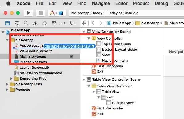 Descargue el archivo zip. Después de extraer el archivo, busque el bleTableViewController.swift en el directorio bleModule, y muévalo al proyecto como se muestra a continuación. Cuando se le pregunta, asegúrese de que está seleccionados "Copiar Items si es necesario".