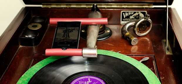 Y luego, Eureka! Yo vi que la parte del diafragma y la aguja del brazo de la derecha vienen fácilmente, revelando una forma sencilla de obtener sonido en el iPhone. Después de aproximadamente una hora, tuve este bebé trabajando.