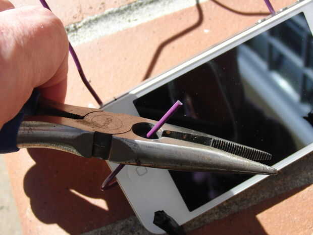 Nota: No doble el hangar de alambre con PDA en su lugar. Sólo pongo allí después de medir unos 5" y de flexión para comprobar el ajuste! Usted notará que al final aún no se graba, creando el riesgo de un rasguño.