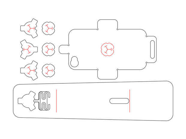 he tratado de hacer lo conveniente y funcional como sea posible. Consta de 4 partes: el pie, la "cuna" y dos piezas para el sistema de sujeción. En el mapa, las líneas negras simbolizan el corte mientras que las líneas rojas simbolizan el grabado. Porque el pie no es un cubo pero trapezoidal, las líneas rectas rojas 2 servirán como puntos de referencia más adelante. Las otras líneas rojas están montando llaves.