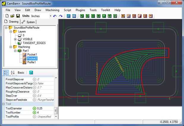 2. generar una trayectoria de herramienta de SoundChannel a una profundidad de 0,85". Recuerde que con esto se iniciará en la superficie. Utilizar 0,25" final molino y profundidad incremento de 0,25". Esto dará como resultado cuatro bolsillos pases con el final de pasan 0,1"– el software se ajustará automáticamente para llegar a la profundidad total. El paso más queda en el 40% de la anchura de la herramienta. Velocidad de corte es 25IPM y la velocidad de la zambullida es IPM 10
