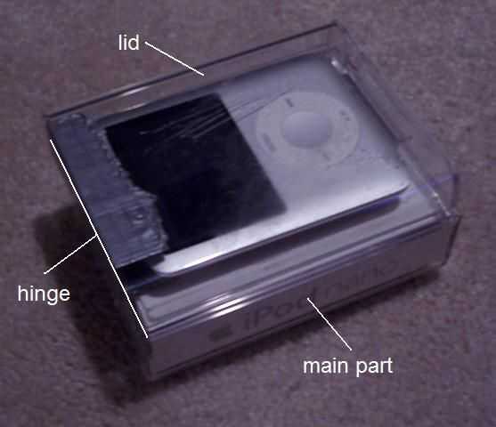 El caso de la pantalla (el caso llegó el iPod) y abra la tapa, debe haber un pedazo de plástico con dos clavijas en lo interior que el iPod, sacar la pieza de plástico y ponerlo al lado. Ahora con una mano agarra la tapa y con la otra coge la parte principal de la caja de plástico. Hay un pedazo de cinta adhesiva clara creación de la bisagra, Pele el plástico de la parte principal (pero no la tapa). Ahora que ya no se unen las dos piezas podemos ir al siguiente paso.
