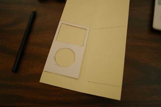 Lo que estamos haciendo aquí es crear dos mangas, cada que cubren tres de los cuatro lados del iPod. Primero vamos a hacer el manga "interna". Así, en el lado izquierdo de la carpeta, establecer la plantilla que remonta de la caja del iPod, alinear con el pliegue correcto. Trazar los cortes sobre la carpeta.