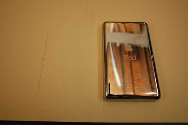 Ahora, deslice el iPod hasta contra el pliegue original en la carpeta de manila. Esto evitará que el jugador agradable y paralela al borde. Suavemente, trace una línea sobre la carpeta que representa el borde del jugador.