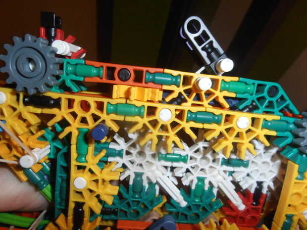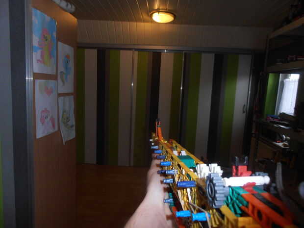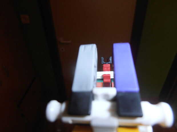 La parte delantera de la pistola. Parte inclinada es el mango frontal, a la derecha ves el cañón expuesto y punto de mira.