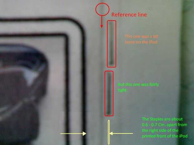 también hacer una línea de referencia para alinear las grapas, para que las grapas están en 0,6 o 0,7 Cm aparte de la parte inferior del frente del impreso del iPod.