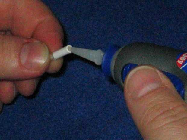 a continuación, agrega algunos pegamento en el tubo blanco pequeño, se deslizó el bucle a través de la tapa y el corchete y entonces se inserta en el tubo de plástico pequeño. Tuve que conseguir un destornillador pequeño para empujarlo forma en la primera de ellas porque no era cuidado al derretir la punta. Era un poco pequeñito demasiado grande. Una vez que se pone en, deje que se seque.