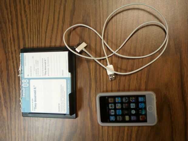 este es un super fácil de hacer que el IPod Touch soporte para usar su carga synch cable y auriculares jack mientras tu IPod Touch de pie en posición vertical usando nada pero una pagina barata un calendario de escritorio del día.