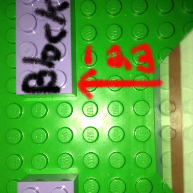 Casi listo! Sólo necesita sus 2 cuadras. Como se muestra en la foto, guíese por la pequeña torre. Ver la torre y bajar tres clavijas. Es donde sus bloques van a ir. Deje suficiente espacio entre los bloques.