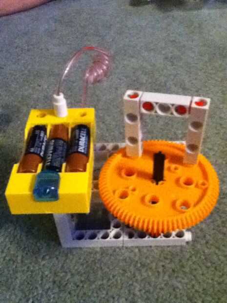 Cuadro 3: Añadir un motor tan el turner de polos en el motor attatches al polo negro. También, tomar el grande Polo negro y deslice un engranaje rojo abajo. Coloque la parte inferior de la varilla en el orificio frente el equipo turner y asegúrese de que tocan la marcha y su turner.