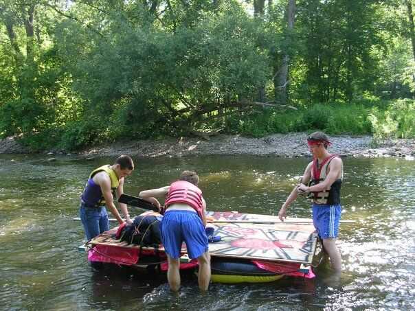 Además el grupo coloca un montón de cuerda del amortiguador auxiliar alrededor de una rejilla de agujeros para hacer una cosa de mantener todo muy útil. El cable fue conectado a través de dos líneas de agujeros de un costura esque fashon para producir un montón de líneas de la cuerda del amortiguador auxiliar paralelo en la cubierta superior de la balsa que cosas se podrían poner bajo una sujeción ajustada.