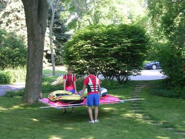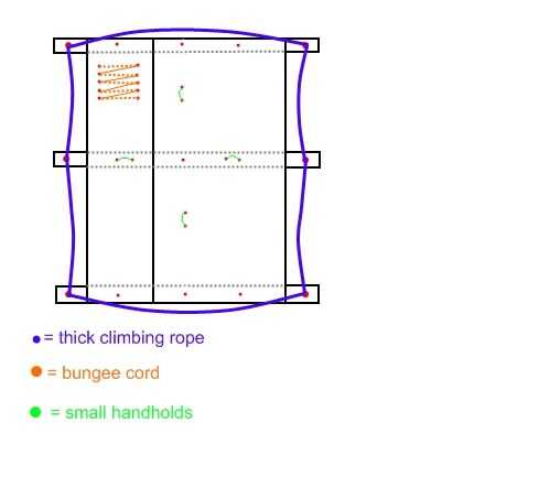 Esencialmente, hemos instalado una gran cuerda de escalada gruesa alrededor del perímetro de la balsa y luego ponemos cuatro mano sostiene/amarre bucles en los puntos cardinales hacia el centro de la balsa. Estas bodegas también se convirtió en catch alls cuando atamos cosas a ellos con mosquetones durante el viaje así.