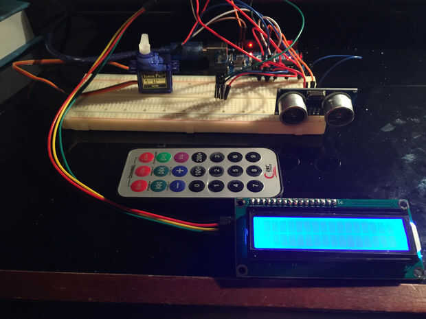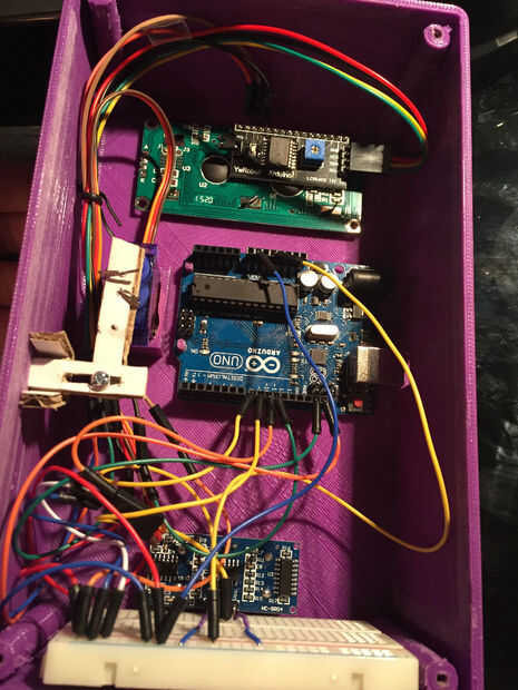 Hay una guía de 3 caras para el mecanismo de brazo del motor servo deslizar en y fuera de. Esto no puede ser necesaria dependiendo de cuánto usted decide hacer el orificio del mecanismo de bloqueo. Replican un mecanismo de bloqueo con dos pedazos de cartón. La primera pieza que se conecta con el motor servo se une a la cabeza y el brazo pequeño (no se muestra porque es debajo de la cartulina). Puede utilizar alfileres o clips para asegurar el extensor de la cabeza del motor servo. Básicamente actúa como una extensión de lo que ya está allí. Al final de esta pieza es un tornillo (o puede usar un trozo de madera o algo similar). En el otro trozo de cartón es una ranura para el tornillo se deslice en. La ranura está ahí para empuje y jale el lock out/in. Las longitudes de las piezas de cartón fueron elegidas en base a las características del agujero y la ubicación del motor de servo. En la parte inferior del módulo hay una placa para el sensor de proximidad de HCSR04 y una potencia para la energía y tierra para todos los componentes (en teoría, no es necesario un protoboard en todos. Una vez que haga los agujeros para el eco y el receptor sensores de ultrasonidos, podría conectar a hembra conectores como se hizo para la pantalla y el sensor de infrarrojos. Entonces todo lo que se necesita es un tren de potencia. Si haces esto, liberaría espacio, aunque todavía tendría el mismo número de cables.