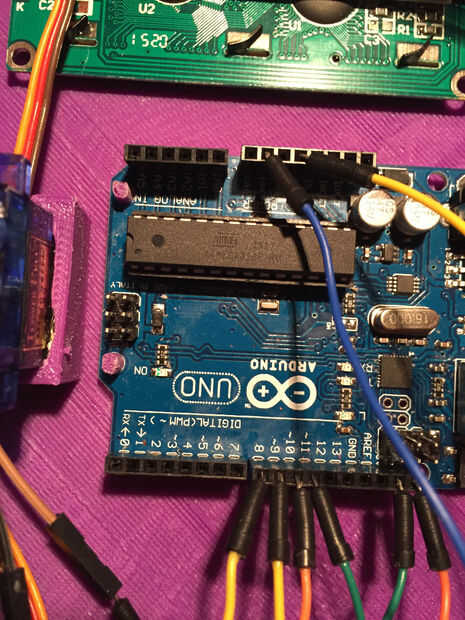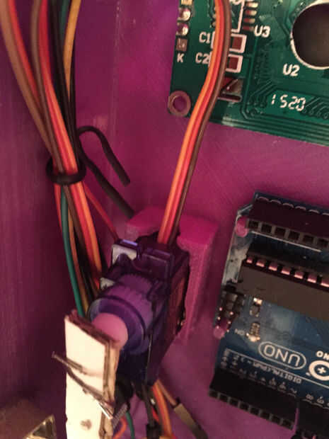 A continuación podrás ver el interior de la caja. Cada parte tiene un lugar. A partir de la parte superior, los cables de la pantalla y el sensor de infrarrojos están pegados a la parte superior de la tapa y twisty-atados juntos para hacer el espacio más ordenadas y compactas. En el cierre para arriba de la imagen del motor servo, verá que tenía a mano tallar algo de espacio para los cables en orden para que ajuste correctamente el motor cinemático. Además, puedes ver que tenía que abrir el interior del compartimento del servo para asegurarse de que el ajuste de motor (el agujero era originalmente demasiado pequeño). En este mismo cuadro, verá las clavijas que sostienen el Arduino. Estos están aquí para mantener el Arduino se caiga abajo y ha también sido depilado abajo de diámetro como estas clavijas también eran demasiado grandes para los agujeros de Arduino. Poner las clavijas es ideal vs simplemente taping/pegar el tablero al dispositivo como usted tiene más flexibilidad en el uso de la Junta para otros proyectos.
