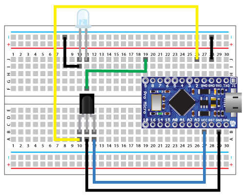 Ahora que tenemos nuestro foco de trabajo, podemos pasar a controlarlo. El diagrama de arriba muestra cómo conectar el receptor IR y el transmisor LED al Micro Pro.