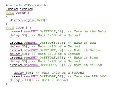Momento de intentar enviar estos códigos nosotros mismos y control de la módulo IR! Para esto usaremos el IRsendDemo y añadir nuestros códigos para controlar el módulo LED.