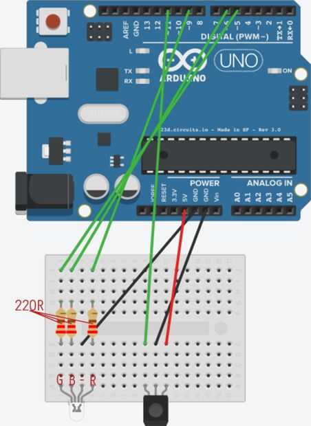 un sencillo tutorial para mostrar la funcionalidad de un ánodo RGB LED común y generando una paleta 7 mezclando entradas digitales un potenciómetro se utiliza en el mismo circuito para controlar los colores aparece con un código de arduino diferente
