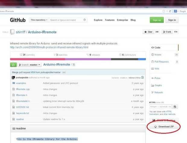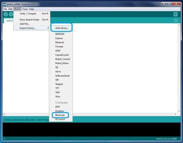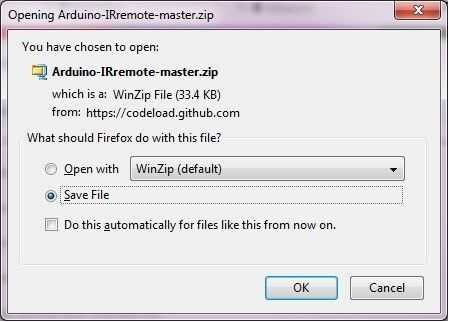 después de instalar la biblioteca... Pernos del sensor IR se unen a Arduino así: (de izquierda a derecha con la cabeza del sensor frente a usted)